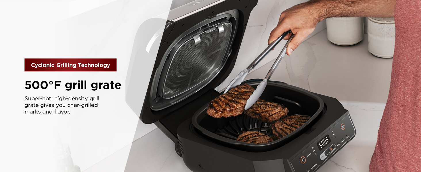 Meet the Ninja Foodi Indoor Grill. The grill that sears, sizzles, and air fry crisps. Updated sleek design from the original Foodi Grill. 500°F of hot cyclonic air for surround searing, while the 500°F high-density grill grate gives you delicious, char-grilled marks and flavor while being virtually smoke-free. It's also an air fry crisper, allowing you to enjoy guilt-free fried food.