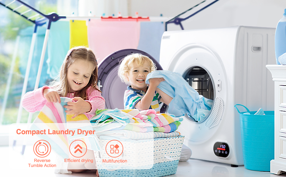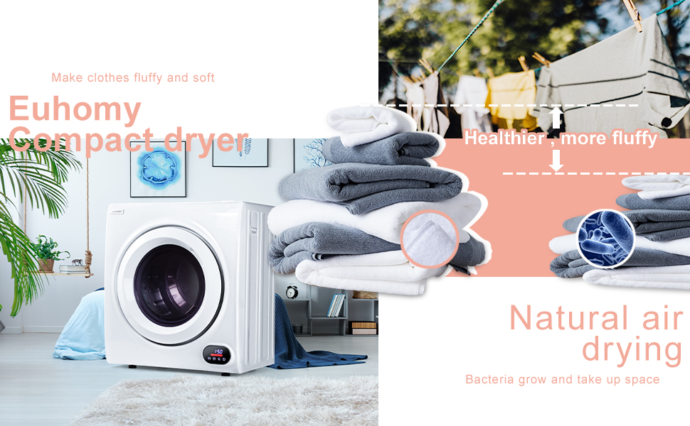 【High performance】This is powerful yet compact clothes dryer machine, euhomy portable dryer has a large capacity of 14.5 pounds(wet clothes). This dryer with 1400W power, It can reach a maximum temperature of 140°F, To ensure that your clothes dry quickly. Note: Use after spin-drying, the drying effect is better.