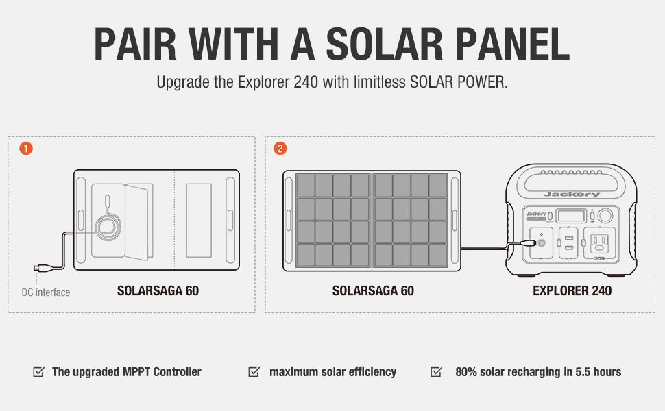- GREEN POWER SUPPLY: The power station can be recharged by the Jackery SolarSaga 60 solar panel or SolarSaga 100 solar panel. Its built-in MPPT controller enables the solar panel to operate at its max power point for the power station to be recharged at its highest efficiency. TWO alternative ways to recharge: through the wall outlet or the car outlet.