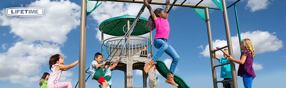 The Adventure Tower Deluxe Playset from Lifetime Products is full of exciting activities for children of all ages. Constructed of UV-protected high-density polyethylene (HDPE) and powder-coated steel, it's durable, weather-resistant, and will not warp, rot, crack, or splinter. From the swing set and slide to the rock climbing walls, your kids will have no problem finding plenty of features to keep busy with. So let your kids enjoy the features and activities while you enjoy the low-maintenance and safety of a Lifetime Playset.