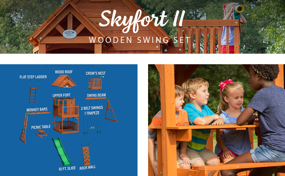 CUSTOMER FAVORITE OUTDOOR SWINGSET: Your kids will have fun playing backyard games on the Skyfort swing set. Nicely equipped with multiple playhouse accessories and features to keep your children entertained for hours.
