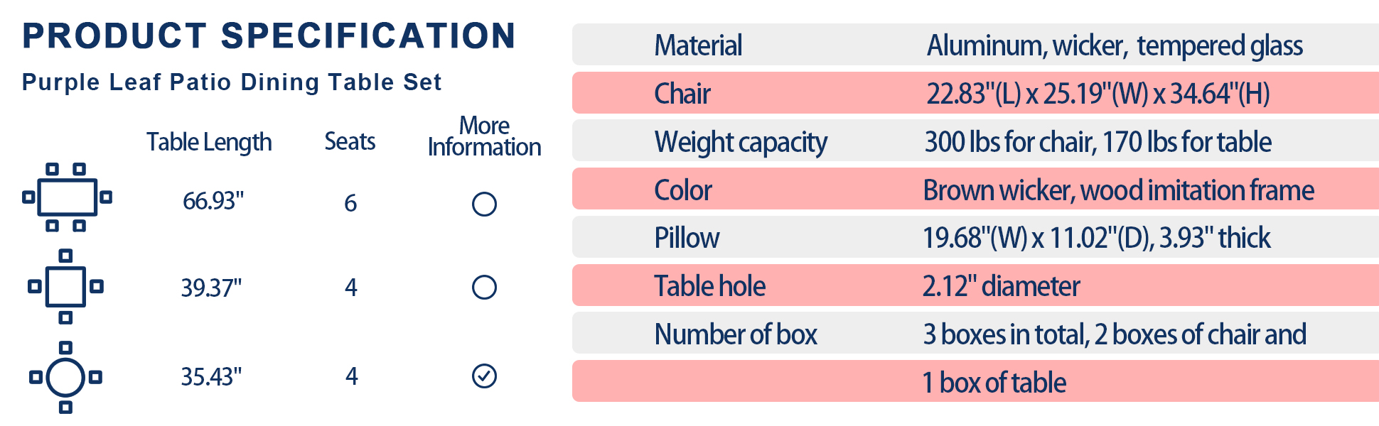 • Purple Leaf patio dining set offers you a great experience in dining time or in conversation.