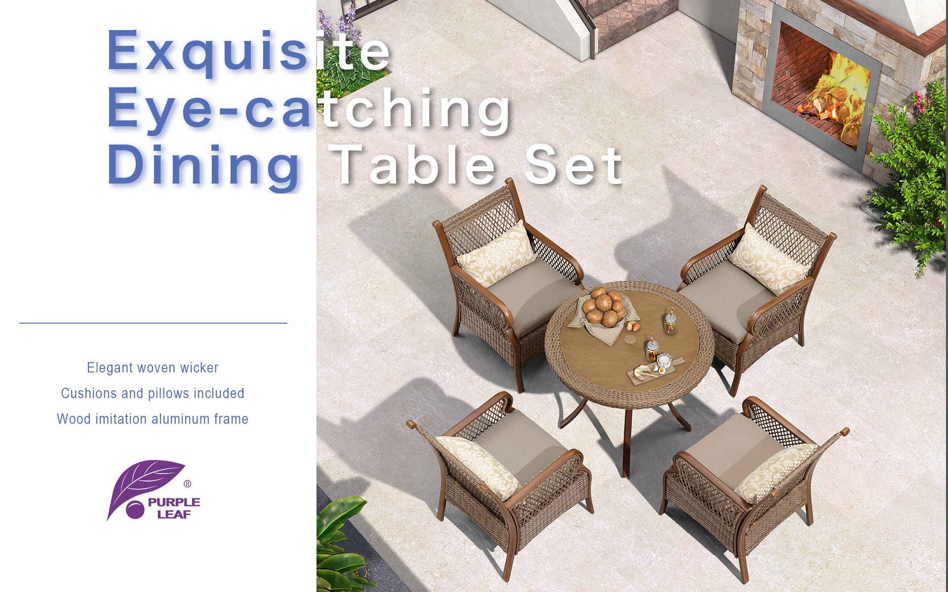 • Set Includes and Assembly: This outdoor dining set contains 1 round table, 4 dining chairs, 4 pillows and 4 cushions. All hardwares, tools and instructions are included for your convenience and quickly assemble.