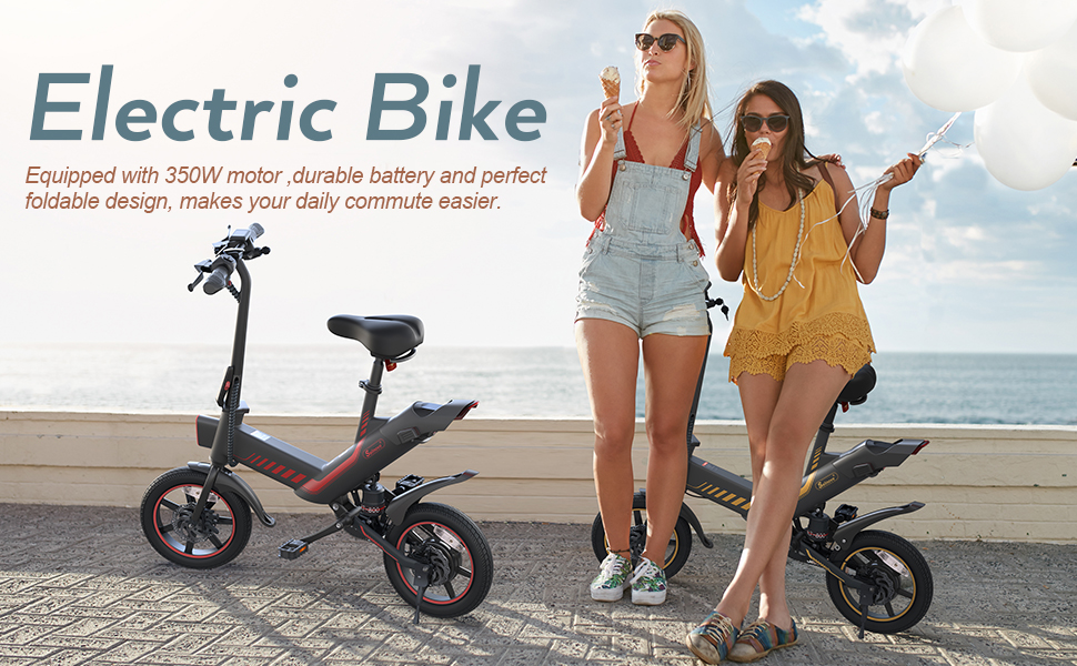 HIGH QUALITY BRAKE & GEAR SHIFT SYSTEM: The high-quality 14 inch air-filled tires provide an excellent cycling stability. This electric bike adopts front and rear double disc brake for providing powerful braking to keep your safe. The horn and the bright LED headlamp are equipped for safe night riding.