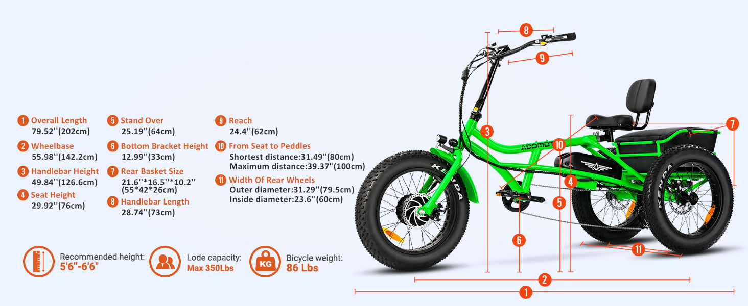 The MOTAN M-360 is a heavy-duty and feature-rich cargo electric trike that is perfect for the rider that needs to haul big loads or for extra support when it is difficult to balance. Fitting for 5'6"-6'6" and it can carry adult weighing close to 350 lbs. Heavy loads are a breeze with an extra-sturdy alloy frame. In the Rear Rack, you can carry close to 100lbs what you want. (Note: New version of trike comes with a big rear bike bag as a gift. )