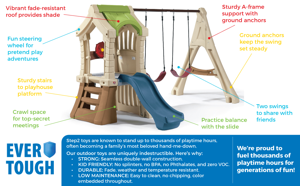 Bring the fun of a jungle gym at the park home to your backyard! This outdoor swing set for kids has a variety of active and pretend play opportunities for your kids. A playhouse and swing set in one, kids will enjoy outdoor playtime for hours with friends flexing gross and fine motor skills, sharing and storytelling, and getting creative with their imaginations! Climb up the sturdy stairs onto the playhouse platform, where a steering wheel awaits for pretend play magic to come to life. Take the slide back down to swing or crawl under the playhouse for secret club meetings! Pretend the playhouse is a pirate ship and use the steering wheel to escape enemy ships; fly through the sky with a make-believe airplane; and even cruise through the desert with a dune buggy – the pretend play possibilities are endless! Plus, this swing set is sturdy and durable; it’s made EverTough to last through the most active play for years with double-wall construction that’s fade resistant, never chips or needs to be stained, and is easy to clean. Secure the ground anchors to ensure this outdoor playset stays strong and in place for kids to enjoy for years to come! Made in the USA of US and imported parts.